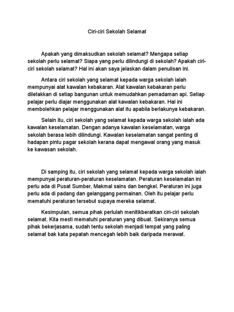 Contoh Karangan Karangan Ciri Ciri Sekolah Selamat - Teks Fabel Pengertian Ciri Jenis Struktur Unsur Makna. Karangan bahasa melayu spm kertas 1 membantu karangan bergambar spm ciri ciri sekolah selamat pdf document. Membolehkan pelajar menggunakan alat itu apabila berlakunya kebakaran. Karangan yg bagus dan isinya padat dan tepat. Oleh sebab itu, tempat kita menimba ilmu . Selain itu, ciri sekolah yang selamat kepada warga sekolah ialah ada kawalan keselamatan. Sekolah atau alma mater merupakan tempat kita belajar.